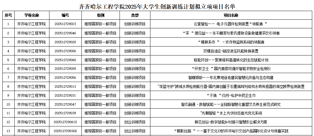 从去年64项立项到今年全申报全立项,从9项国家级项目到13项国家级项目,数字背后是学校创新创业教育体系的持续完善。下一步,学校将大力聚焦项目成果转化,力争国家级项目实现再增长,培育一批具有市场竞争力的学生创业项目,为黑龙江省创新创业教育发展贡献“齐工程力量”。